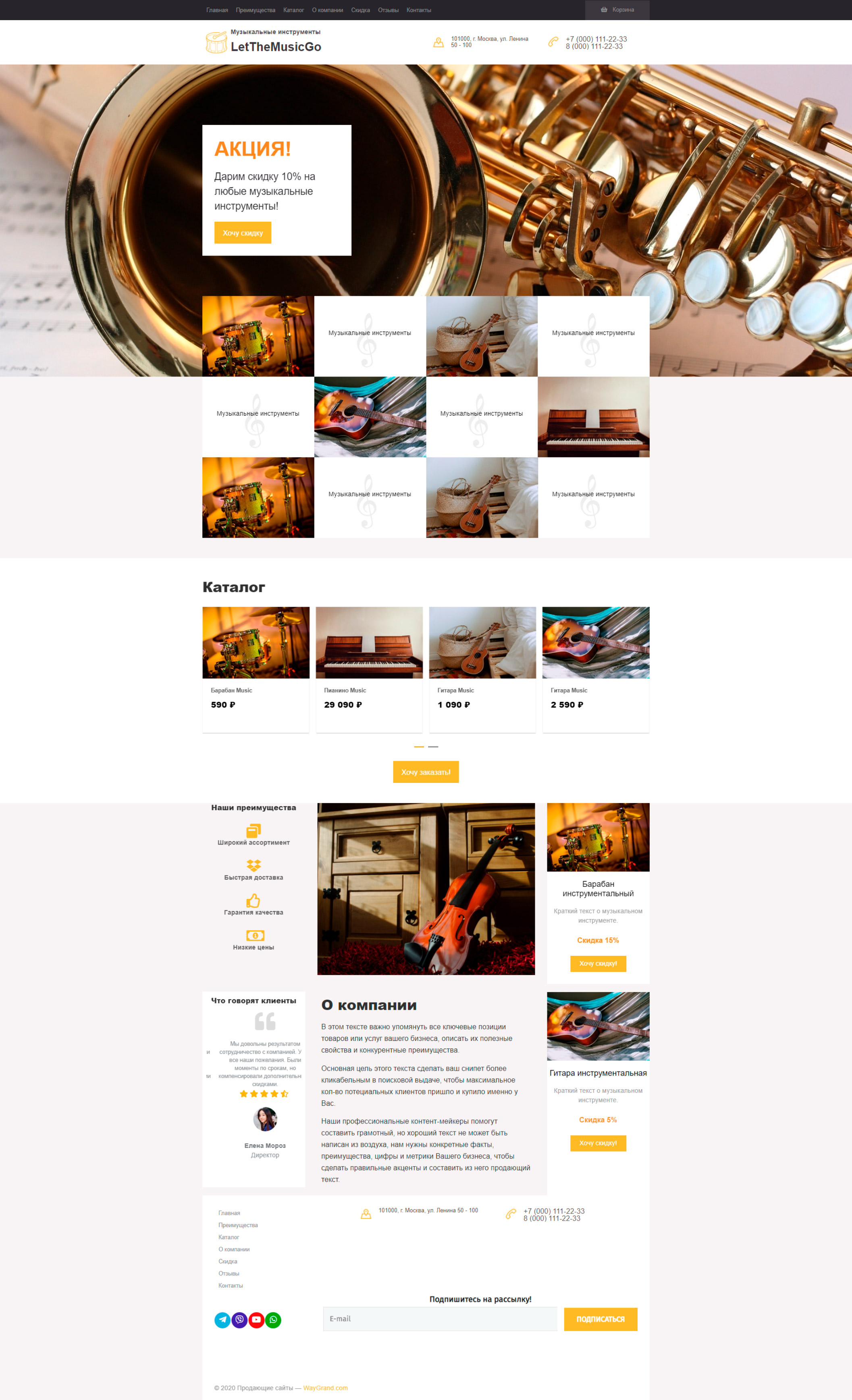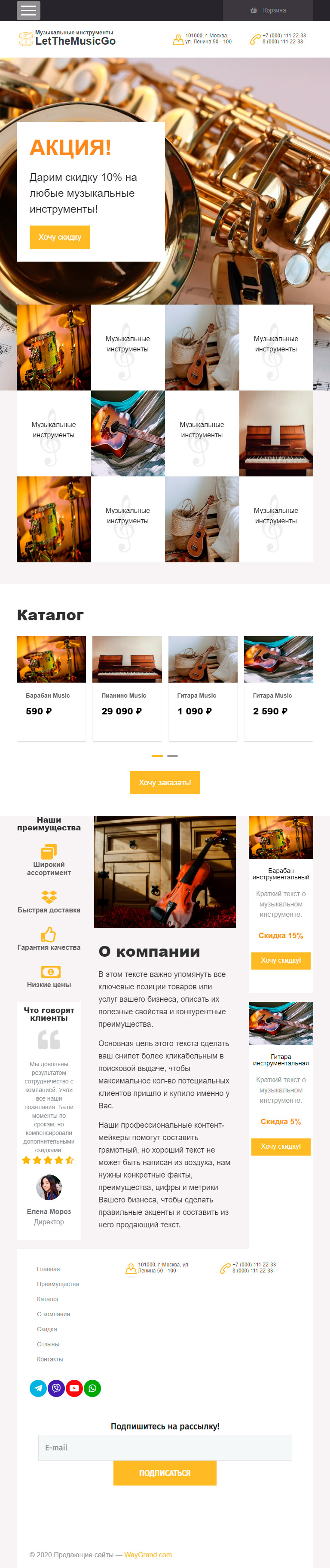 Закажите готовый продающий сайт лендинг #0710201 в Артёме за 1-3 дня «под ключ»: свёрстан, отрисован и готов к рекламе. Тематика шаблона «Музыкальные инструменты».